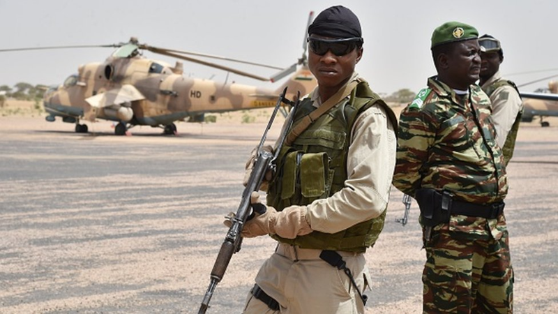 Des soldats et un hélicoptère de l'Armée de l'air nigériane.